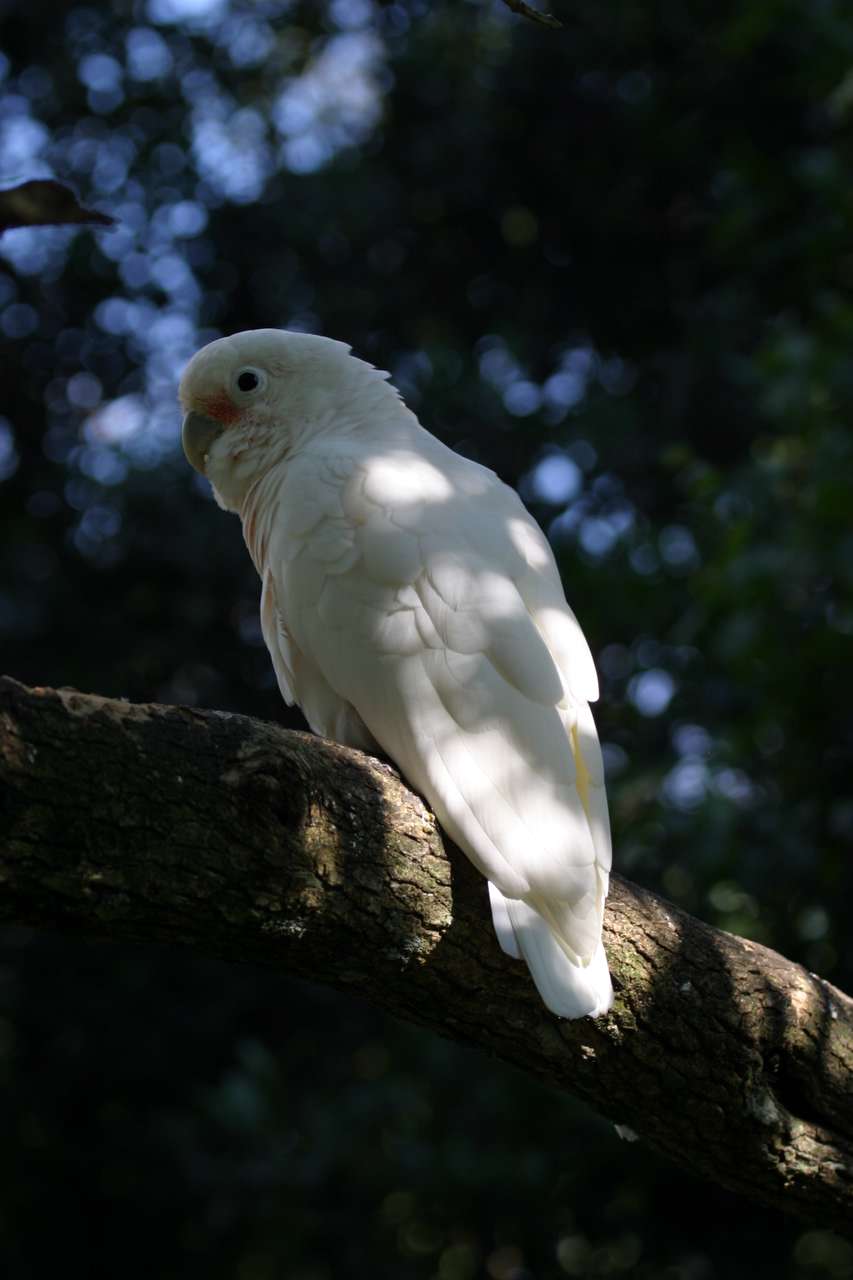 Some kind of Cockatoo Unclear which sort of Cockatoo this is. Could be Bare-eyed or Goffin's. Most likely the latter. Both appear un-crested with some color in front of the eye.