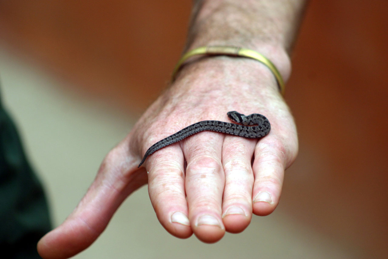 We visited a snake sanctuary and in the pit with indigenous snakes, the guide found a newly born night adder. These are poisenous and therefore have to be handled with care. The most amazing thing is that snakes are just as poisenous when they are little than when they grow up! The guide took the snake on his hand and let it go in the bushes.
