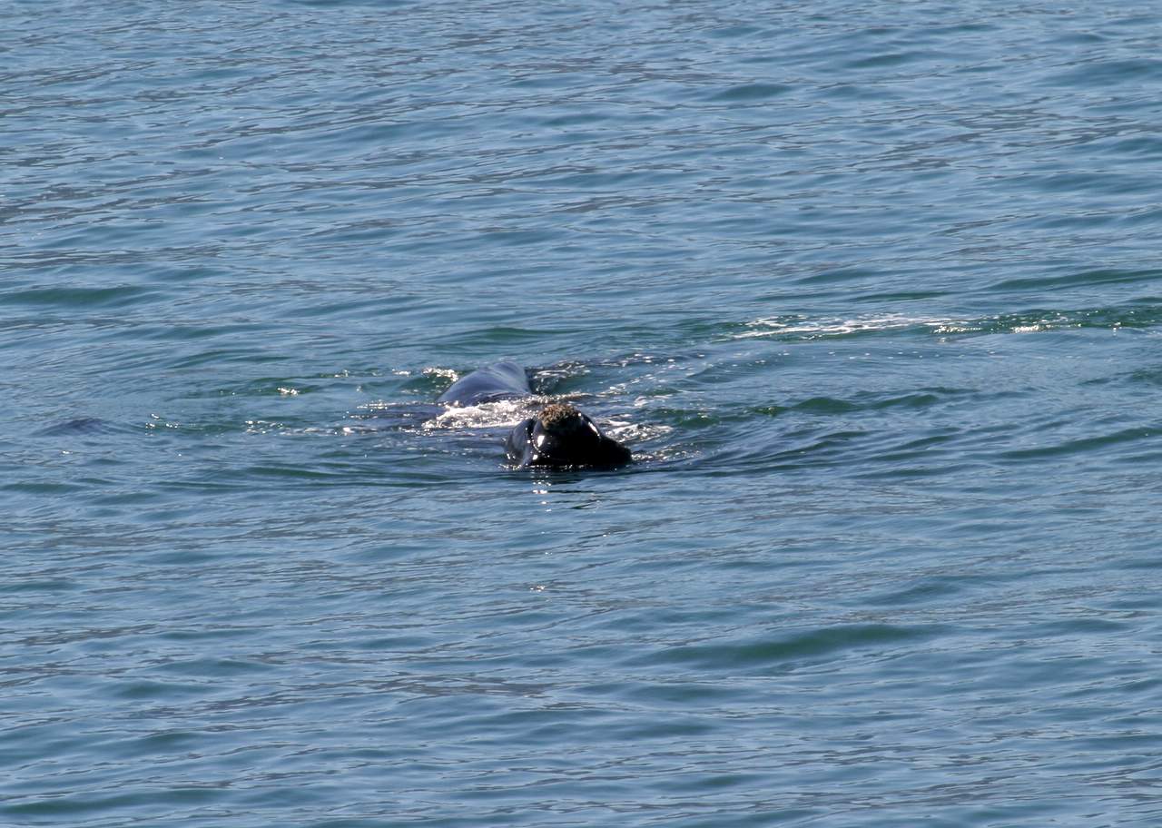 One of the many whales we saw swimming through the water We saw whales very quickly during our trip and spotted more and more as time went on. This whale was swimming close to the shore and in the picture you can see the front of its face, which results in a pretty odd view.