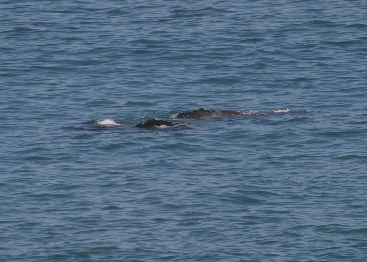 A mother and calf swimming in the bay We were lucky enough to see a mother with calf on a couple of occassions. The females come to Hermanus to give birth, earlier in the season, the males follow at a later time. As the mother and calves are under the water, it is not always possible to see what exactly is going on.