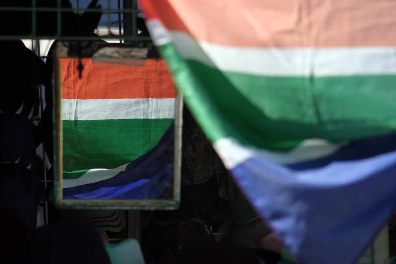 South African flag draped in a booth at the crafts market in Hermanus This sight of the South African flag reflecting in the mirror at the crafts market in Hermanus caught my attention!