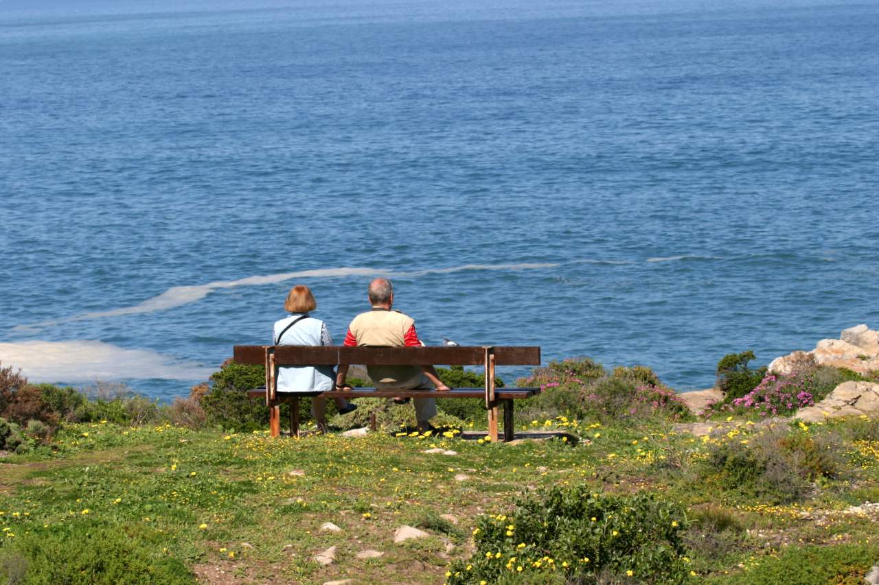 People enjoy sitting at the bay on the lookout for whales A couple sitting on a bench overlooking the bay and, likely, on the lookout for whales. Hermanus is a great place to do so with a 12 km path next to the bay and plenty to see (particularly in whale season).