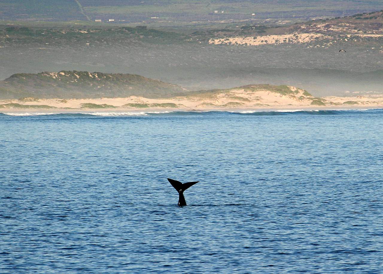 Whale showing its tail, "sailing". One of the things whales do is to "sail" with their tail up above the water. We saw them do this for really long periods of time.