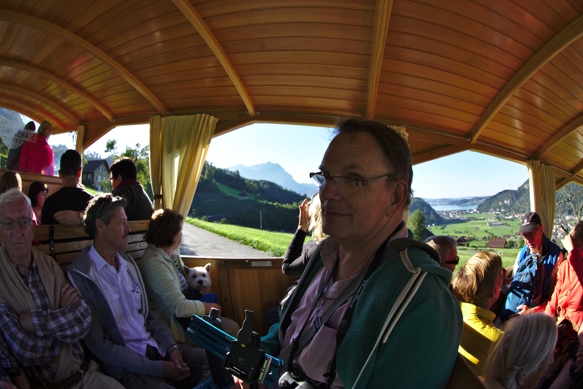 The first part of the trip up to Stanserhorn is with a historical mountain train. You can see Karl in this photo enjoying the beautiful views.