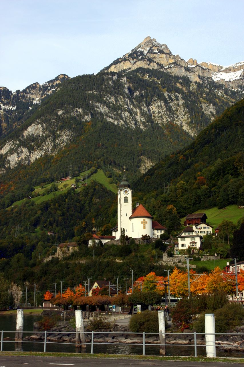 View of the church in the center of Fluelen with beautiful fall colours in the foreground