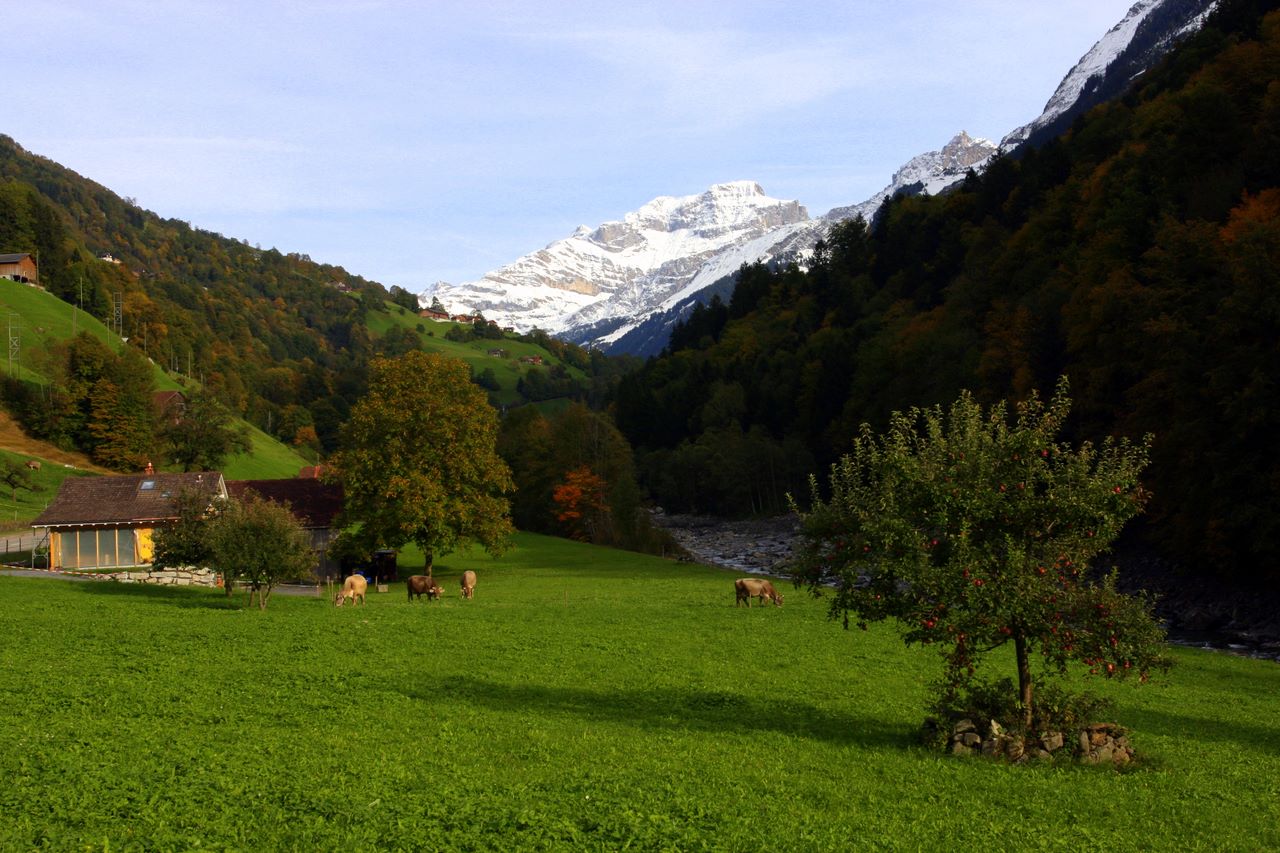 Beautiful fall view of the pasture, with cows, in the foreground, and the snowcovered mountains in the background. Also notice how there are still ripe apples hanging from the tree in front.
