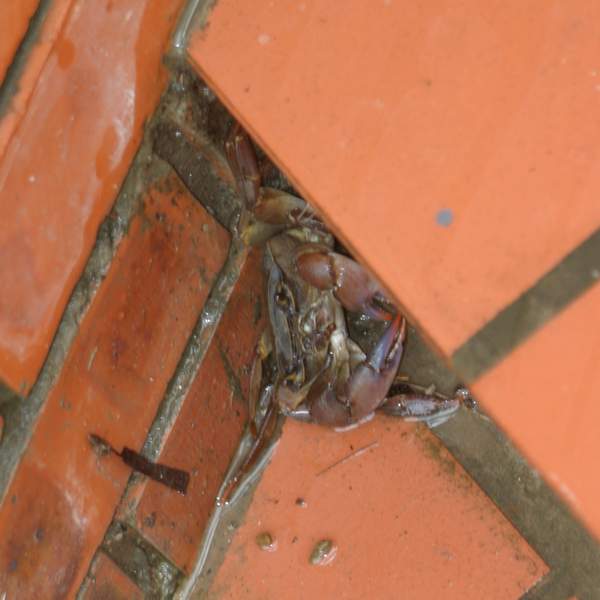 The pool is overflowing. A good wind puts a small amount of the water onto the deck. We had LOTS of rain! But behold, here on the steps going up to the guest flat, is a crab.